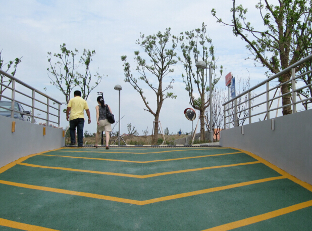5.4施工方法:將抗壓層材料根據(jù)要求配比、充分?jǐn)嚢韬?用鋸齒鏝刀均勻、平整、密實(shí)的攤鋪在抗壓層上,然后再噴涂一遍,形成約4㎜厚表面粗糙的彩色條形止滑帶。