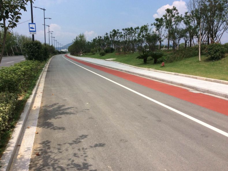 鴻坤彩色防滑路面(綠道),美化了黑色瀝青或灰色水泥土路面,達到了賞心悅目的效果,起到了極大的警示作用。