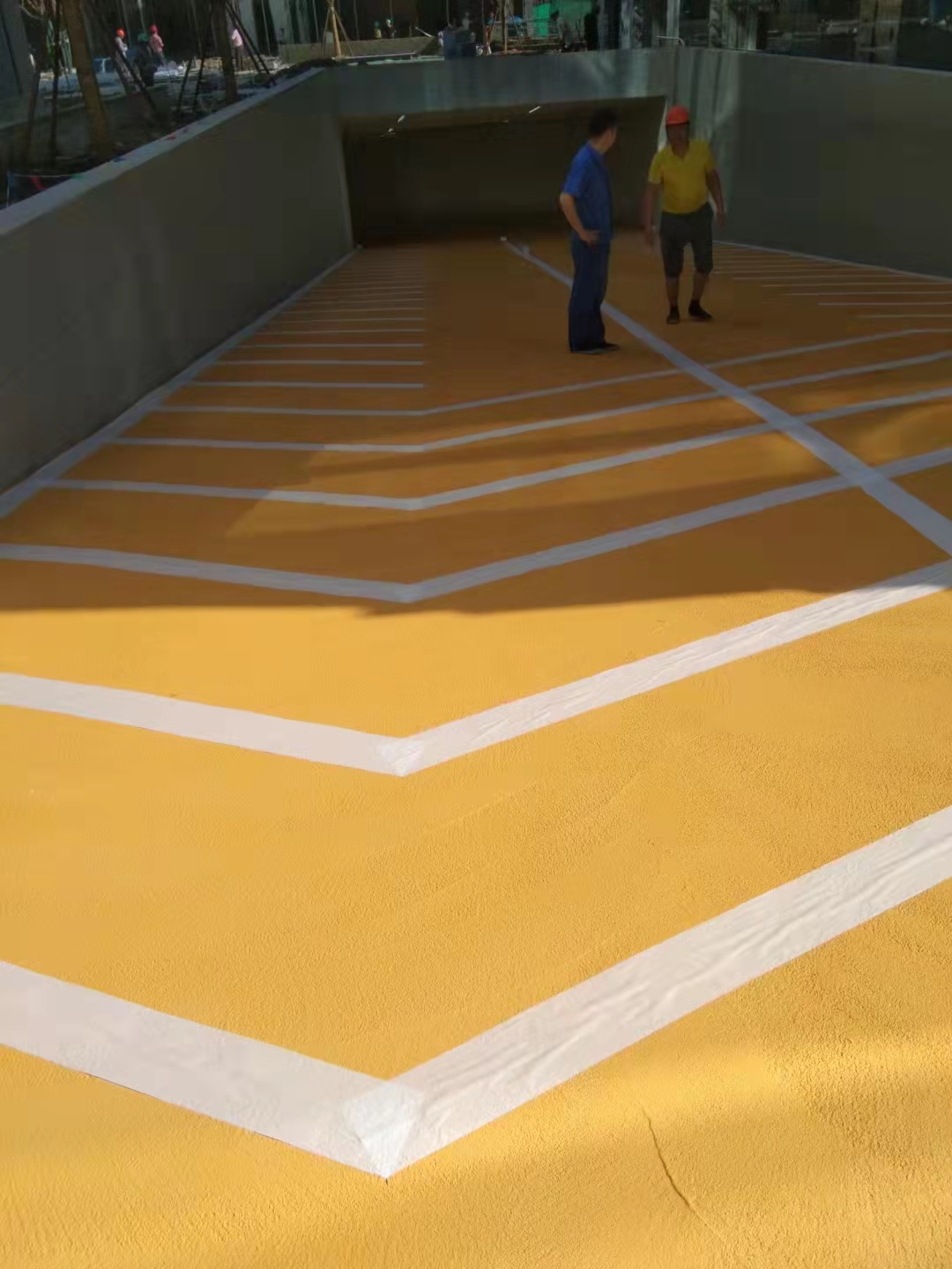 無(wú)震動(dòng)防滑坡道材料施工分為兩層,先平鋪一遍黃色抗壓層,大概2mm厚度,作用是保護(hù)基礎(chǔ)地面不被磨損,另一個(gè)作用是承受基礎(chǔ)的壓力,延長(zhǎng)防滑坡道的使用時(shí)間。黃色抗壓層做好之后粘貼美紋紙,用于設(shè)計(jì)車庫(kù)進(jìn)出的導(dǎo)向箭頭,間隔在80-100cm,按整體長(zhǎng)度平均分。
